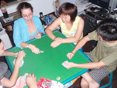 One of our fun teacher buddies, Andy, has been inviting us over sometimes on the weekend to play mah-johng/cards/drinking games. Even though he speaks excellent English because he spent a year in Canterbury, it’s still some of the best exposure to Chinese culture we’re really getting, since we spend a lot of time hanging out…