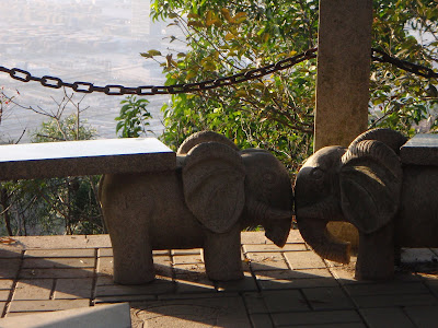 The mountain was a lot smaller than our local Wutongshan, which was quite a relief. Climbing the mountain offered its own charms, of course. The view was really cool, and we could see the oddly balanced bridge from Shenzhen to Hong Kong. There were also cute elephant benches and a fun turtle statue.
