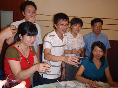 The most favorite activity at these banquets is, of course, trying to get everyone way drunk. Here is a sample of a toast that had gone on for at least 15 minutes prior to this. My favorite is the cute guy in the blue shirt in the background, who, though was not drinking himself, decided to take on the role of “drink commander” and kept fueling the drunken fire. Keep in mind everyone here is grade school math, science, and english teachers who have class in the morning, or heads of the entire school board.