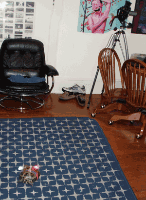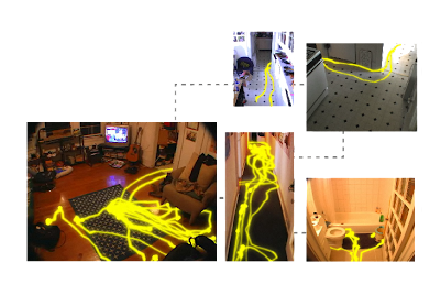 While the top-down view of the tortoise’s progress presents a clear picture of her trails on overlaid stimuli maps, I also sought to visualize an averaging of her movement in a familiar and concrete fashion. I originally got the idea of representing her progress in typical human perspective views of rooms from Flickr user Bartlec who used long exposure photography to capture the paths left by his roomba as it cleaned his house.