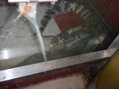 (ANDYUPDATE: I noticed these when i went with a friend to the convience store next to it to get drinks. What first caught my eye was the center bucket, which was FILLED with beetles! crawling over each other in such a way as to produce a very soothing visual display. I kept staring because it was like a massage for your eyeballs. There are snakes, turtles, live prawns, live frogs in bags, angry crabs that a lady comes by to mist with a little sprayer, and one place had a huge live alligator! BTW- yes these are all for eating!)